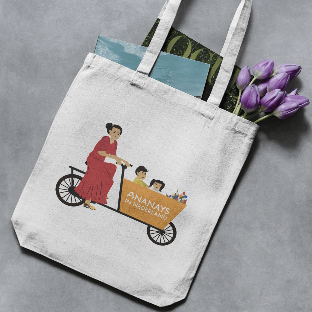 A meaningful logo and custom illustration created for the Pinanays in Nederland group—a warm, supportive community of Filipina moms in the Netherlands. This design captures the essence of Filipino motherhood abroad: a proud Pinay mom riding a bakfiets with her little ones, and the tulips she got from the market.